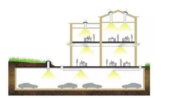 取代了白天用電照明,通過采集日光并利用折射等技術(shù),將室外自然光轉(zhuǎn)換到室內(nèi)照明。順便也解決了建筑不能做吊頂、給建筑內(nèi)帶來地眩光、冷熱給空調(diào)帶來的負(fù)荷等問題。